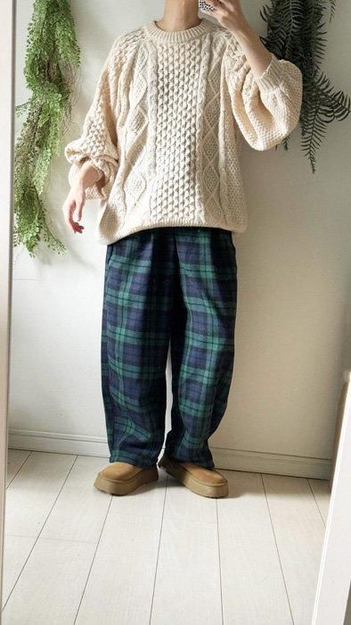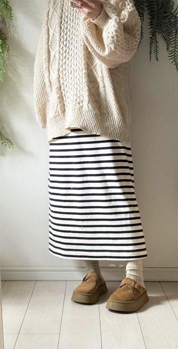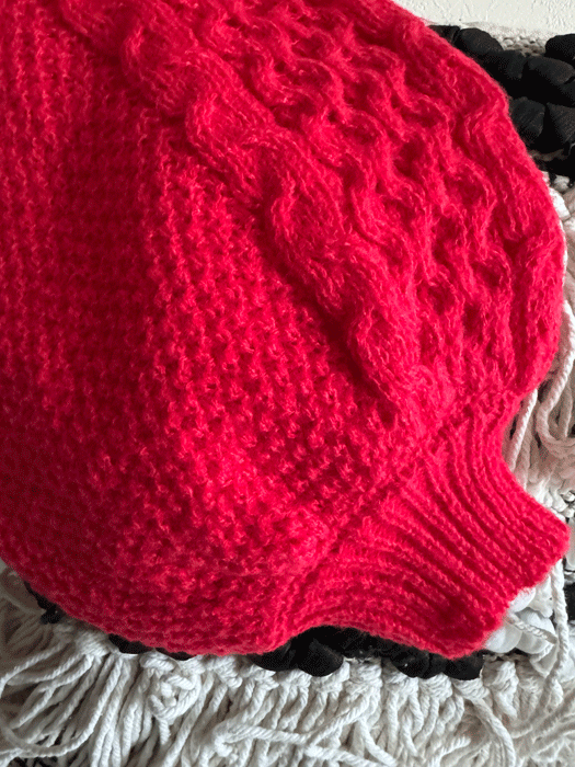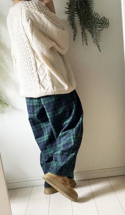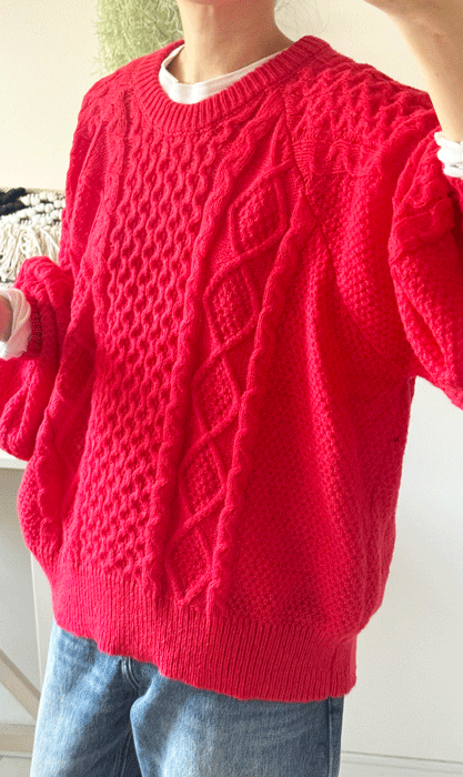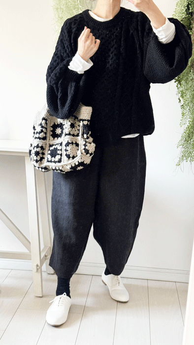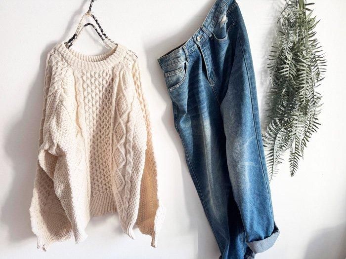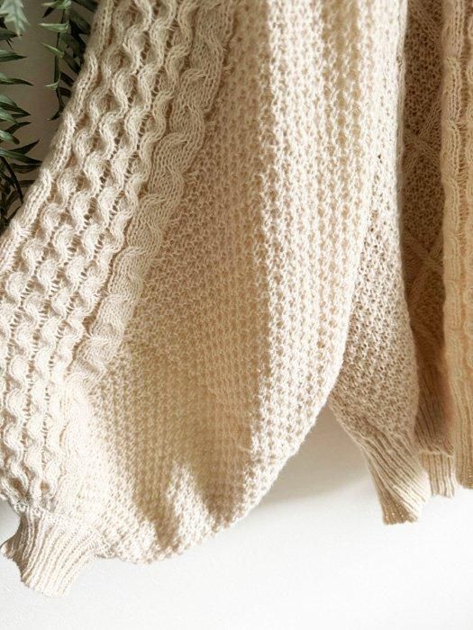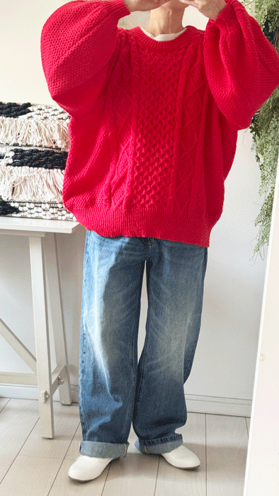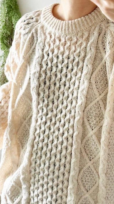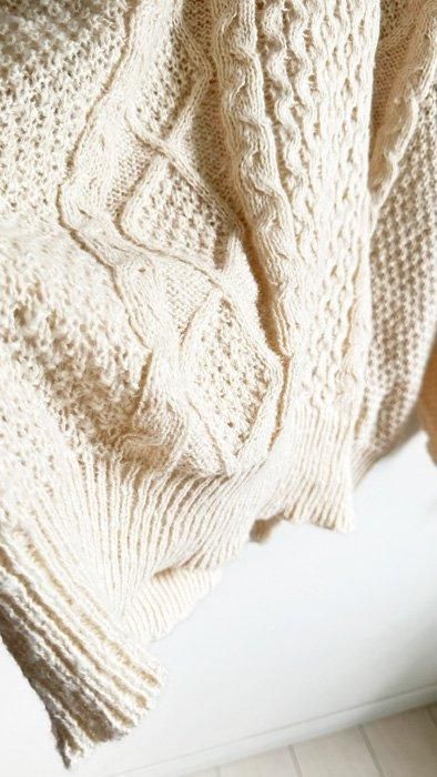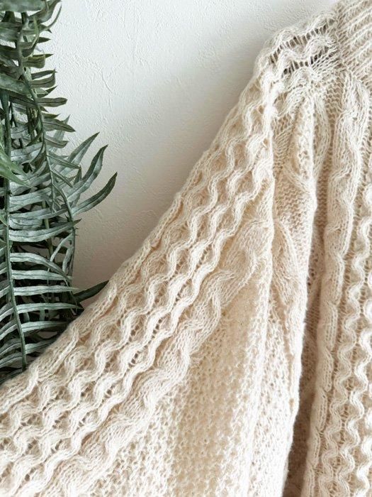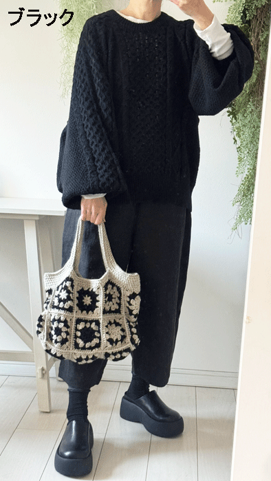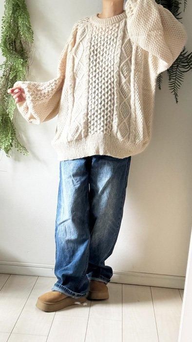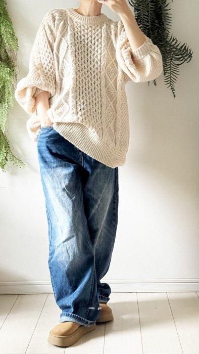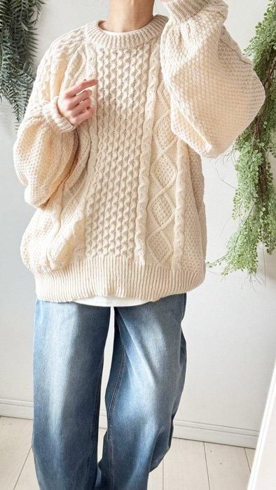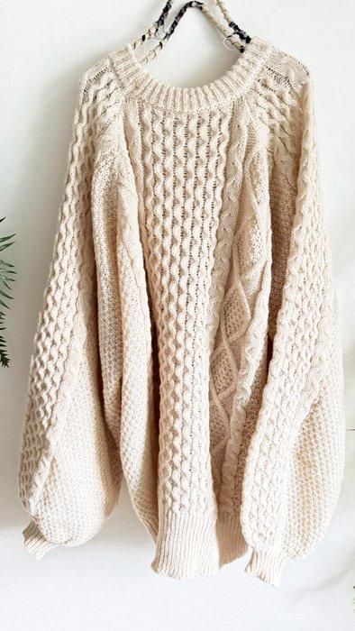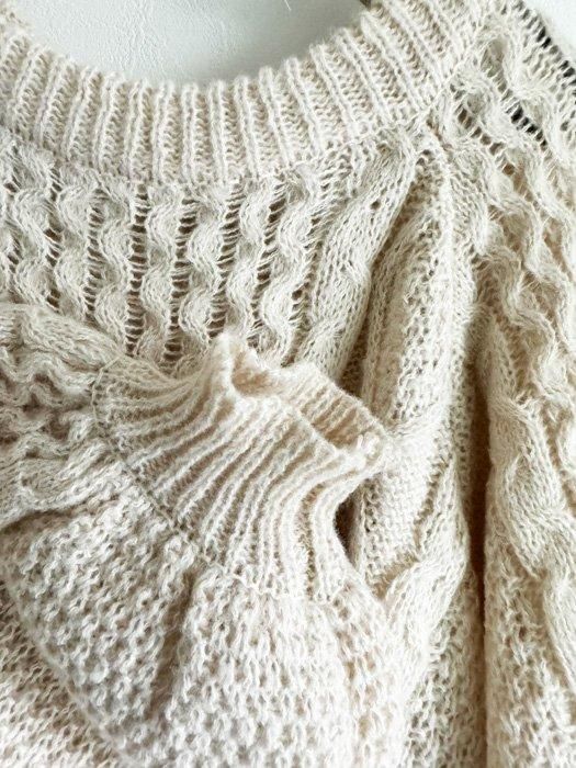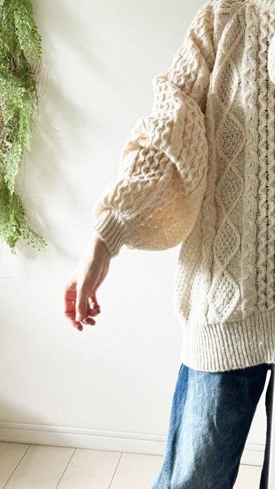 ケーブル柄ボリュームのある袖が、見た目にも存在感のあるローゲージニット。