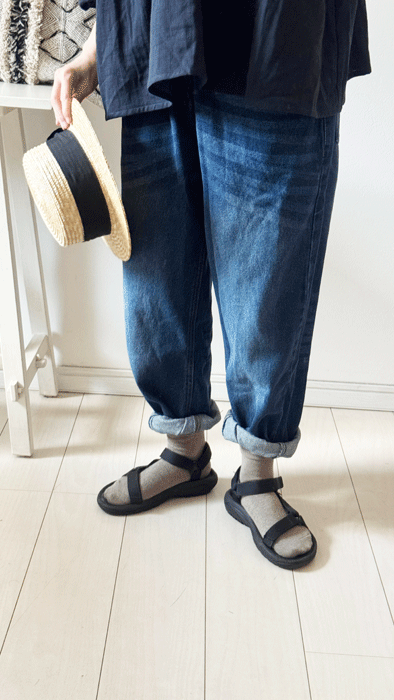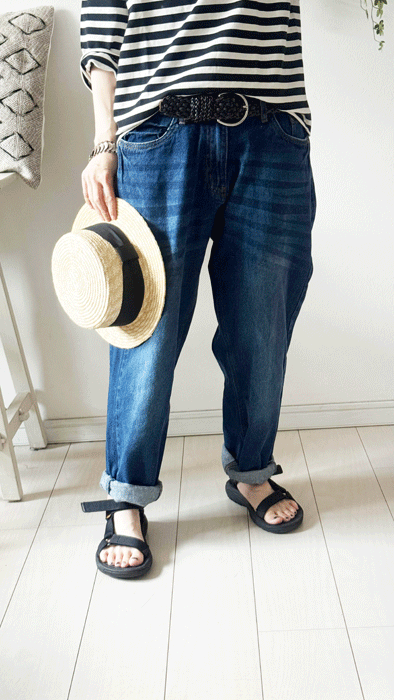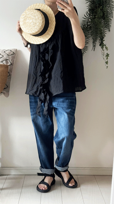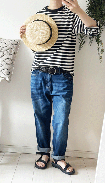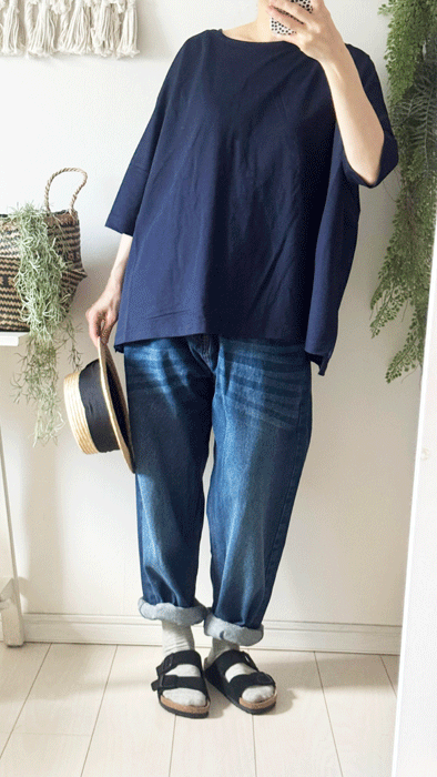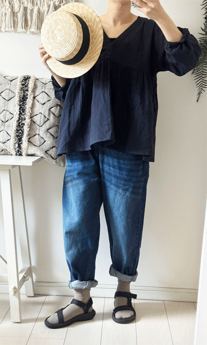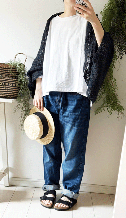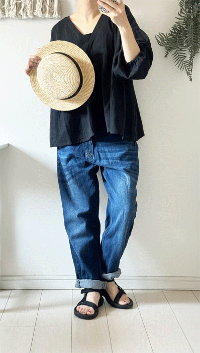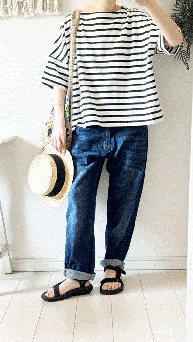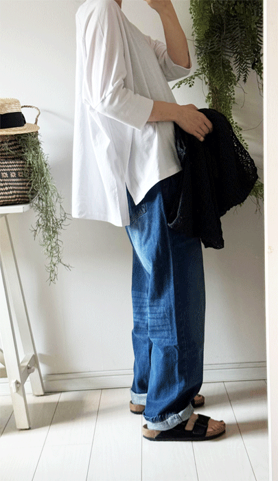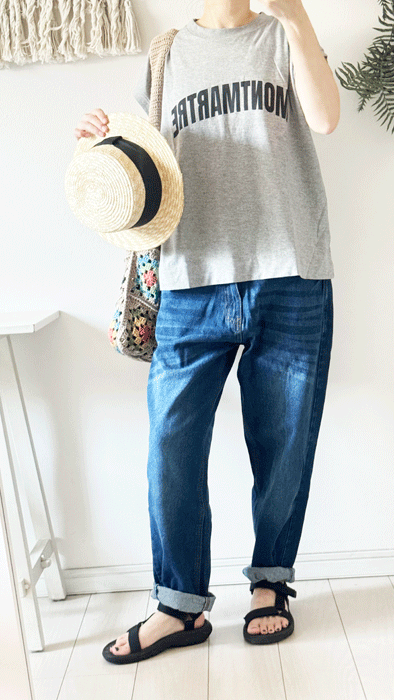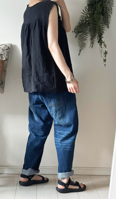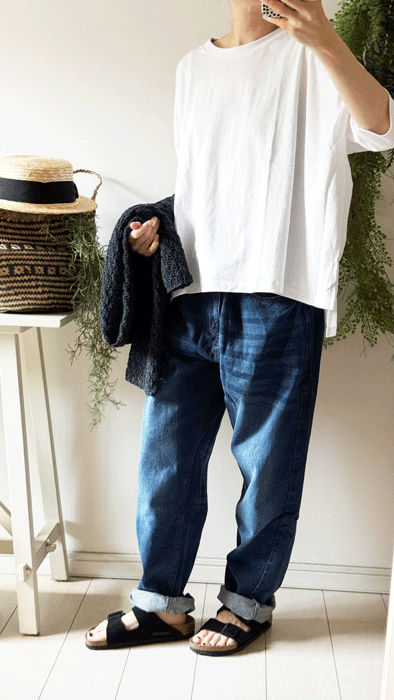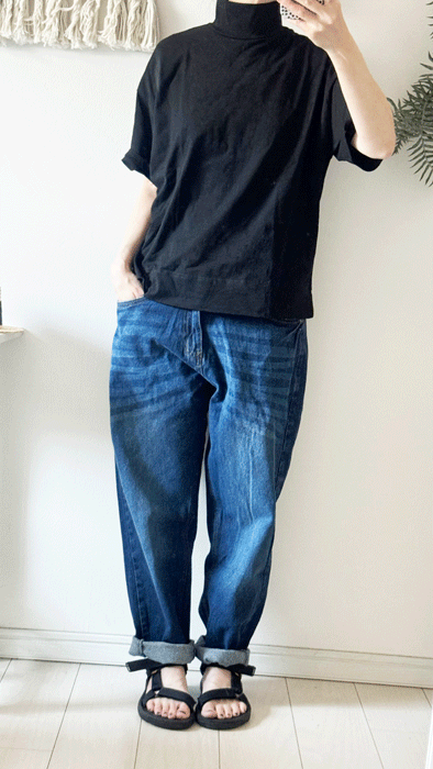 毎日のコーデに着まわせるシンプルなテーパードジーンズ。