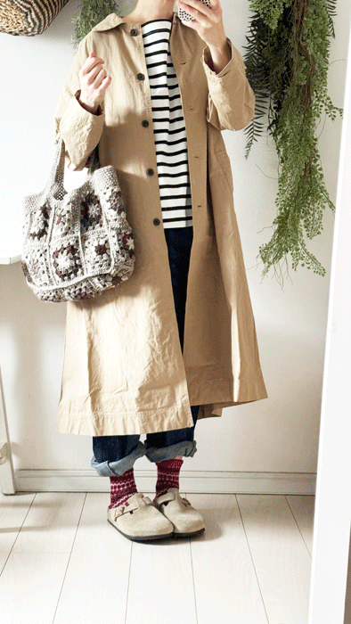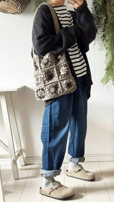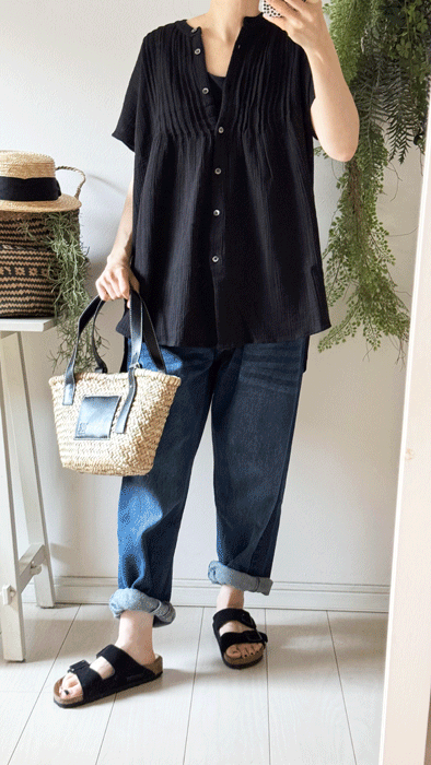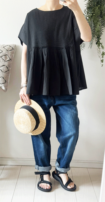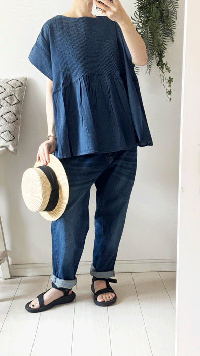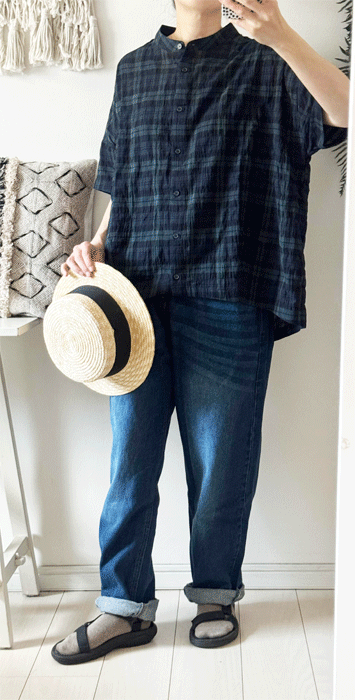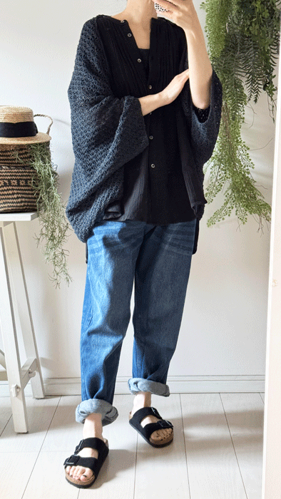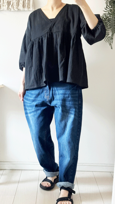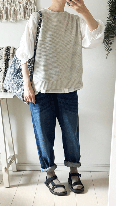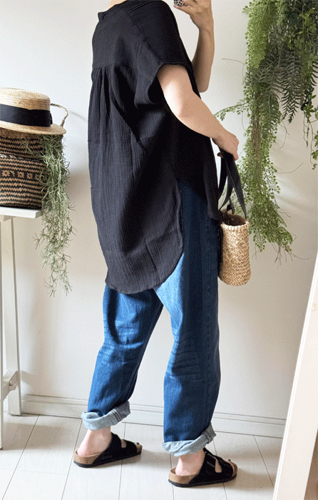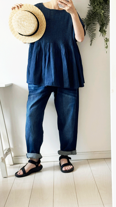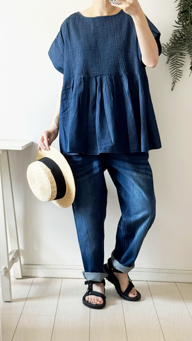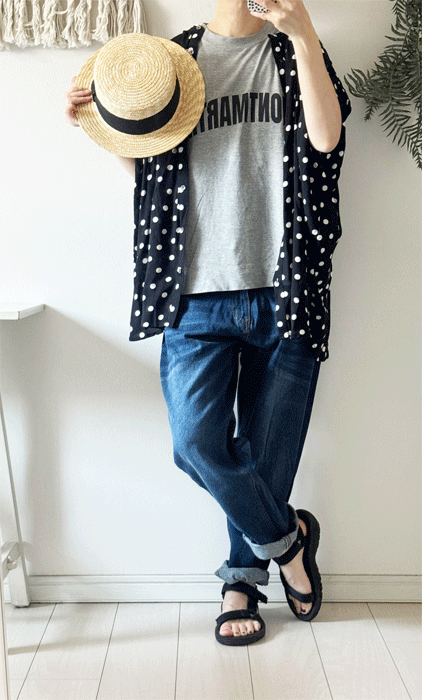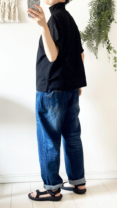 毎日のコーデに着まわせるシンプルなテーパードジーンズ。