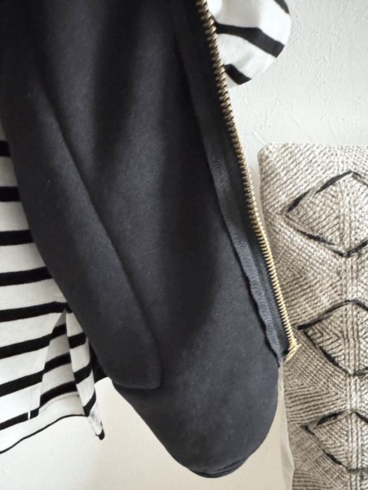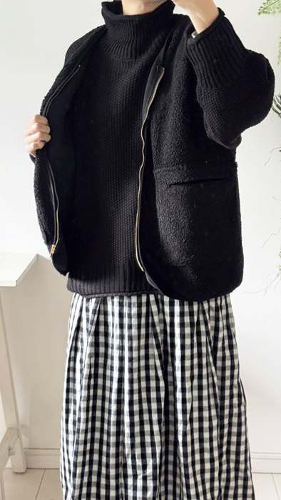 深めのVネックとジップアップ仕様で、シャツやカットソー、ワンピースとの重ね着もすっきり決まります。